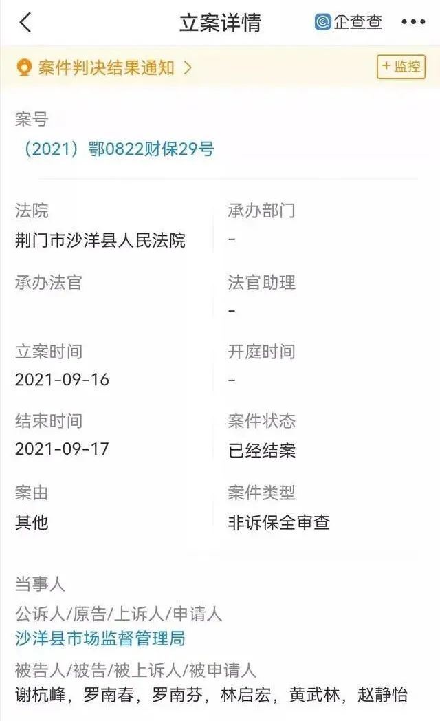 今年9月19日,有媒体报道称,企查查上公布了一则立案信息,显示谢杭峰、罗南春、罗南芬、林启宏、黄武林、赵静怡等人被执行财产保全。 据悉该案件立案时间为9月16日,原告方沙洋县市场监督管理局将上述人员诉至湖北剩门市沙洋县人民法院,申请财产保全,目前该案显示已结案,进入到执行阶段。