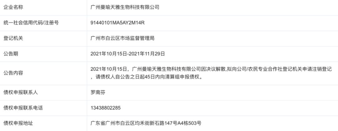近日,美商社注意到,广州曼瑜天雅生物科技有限公司(以下简称曼瑜天雅于2021年10月15日因决议解散,拟向广州市白云区市场监督管理局申请注销登记。 企查查显示,该申请的公告期为2021年10月15日-2021年11月29日,根据相关要求,曼瑜天雅应自公告之日起45日内向清算组申报债权。