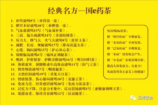 图片来源药茶营销人员提供 夸大宣传的歪理以及割韭菜的镰刀 为了能让购买者信任中医,贬低西医,在振中协营销人员口中有10句夸大中医的口号1、中医是文化;西医是科学。2、中医是整体观念与辨证施治;西医是靶向定位与切割化验。3、中医诊断是望闻问切;西医诊断是视触叩听。4、中医治疗疾病是釜底抽薪;西医治疗疾病是沸鼎添水。5、中医治疗疾病是追根求源;西医治疗疾病是局部表现。6、中医治病注重精气神;西医治病注重肿疡创。7、中医看仓阴阳表里寒热虚实;西医看仓红肿热痛,血尿粪便8、中医用药分温热寒凉,升降浮沉;西医用药分成人量儿童量,加减同药。9、中医中药博大精深,取之不尽用之不竭;西医西药断章取义,旧除新添后患无穷。10、中医让人稀里糊涂的活;西医让人明明白白的死。作为割韭菜的镰刀国药,有16大产品,能治疗的症状轻者减肥祛痘,重者三高慢性咽炎。