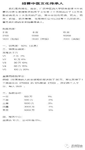 图片来源药茶营销人员提供 涉传的五级代理模式 从以下该公司招聘信息来看,我们以1400元购买原价2168的药茶三盒可以成为初级代理,以3500元购买原价5568的药茶8盒能成中终极代理,以7000元购买原价10628的药茶15盒可以成为高级代理,成为会员后可以拿到50%的销售奖。直推业绩奖分为5个部分,例如说你直推业绩达到2万,可以拿到3%的奖励也就是600元,还有投资者分红也分为5个部分,最低投资为100万,可以拿到1%的分红,最高投资额为5000万,可以拿到5%的分红。