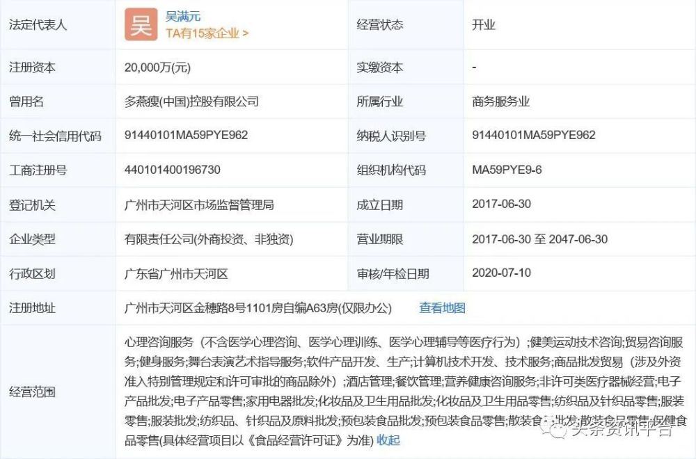 (郑多燕) 而多燕瘦的董事长吴满胜,人称天使哥,微商界尊称为微商创业教父,在2012年投资创立了爱瘦国际控股有限公司(已告解散),简称爱瘦国际,在2014年又成立了天使哥和他的朋友们电子商务(上海)有限公司,该公司目前在负责经营名为多燕瘦的公众号。 值得一提的是,就在今年,多燕瘦(中国)有限公司和涿鹿县北欧生活馆,因产品责任纠纷问题被一起告上法院。 身陷纠纷,诉讼不断 作为多燕瘦(中国)有限公司的股东之一,蜂了时尚科技(上海)有限公司却是声名狼藉。 据了解,该公司于2013年成立,法人代表吴满元,董事长吴满胜,由杭州惠美惠时尚科技有限公司百分百控股,目前在经营名为多燕瘦Dyesoo的公众号。公司原名为多燕瘦减肥服务(上海)有限公司,于2019年8月19日更名,同时法人代表也由文艺变为现在的吴满元。 然而据天眼查资料显示,该公司曾多次作为被告陷入各种广告合同纠纷、买卖合同纠纷、劳动合同纠纷、肖像权纠纷等。 2017年7月,因侵害商标权纠纷被广州美漾尔贸易有限公司告上法院,后来由原告撤诉收尾。 2018年3月,又因网络购物合同纠纷被告上法院。据悉,原告通过网络购物的方式在公司的淘宝店上先后两次购买了产品,在第二次收货时发现产品的执行标准GB19883已被作废,其不符合食品安全标准,故拒绝签收并要求退还全部货款,最后法院经过查明后对原告的诉讼请求予以支持。 2019年5月,与申请人上海零点市场调查有限公司发生服务合同纠纷,申请人在仲裁程序中提出财产保全申请,最后法院裁定冻结多燕瘦减肥服务(上海)有限公司银行存款132590元。 今年,有关蔡徐坤倾情代言多燕瘦吸油丸的广告在网络上大肆宣传,最后明星蔡徐坤因为肖像权纠纷起诉了蜂了时尚科技(上海)有限公司。 同年5月,公司作为被告相继陷入与上海优车库文化创意产业发展有限公司、上海微拓健身管理咨询有限公司的房屋租赁合同纠纷和联营合同纠纷。 10月,又与成都新潮传媒集团有限公司产生广告合同纠纷,同时此案也作为民事案件类型立案。 现如今,蜂了时尚科技(上海)有限公司在一系列的诉讼判决后,于法定的上诉期满后尚未履行法院的仲裁裁决,已被上海市宝山区人民法院列为被执行人。 违法食品,吊销许可证 除了以上我们提到的各种纠纷,蜂了时尚科技(上海)有限公司在去年11月还因为生产经营添加食品添加剂以外的化学物质和其他可能危害人体降物质生产的食品,遭到当地市场监督管理局给出的罚款14万元并吊销许可证的行政处罚。 据相关报道显示,2019年8月,宝山区市场监督管理局接到线索反映蜂了时尚科技(上海)有限公司经营的多燕瘦酵素吸吸冻(番石榴味)(生产日期:2018年9月17日)检出匹克硫酸钠,紧跟着便联合区公安分局对公司的货运仓库进行检查,查存同类产品120箱,对7个品种的食品进行第三方送检,最后查出2个批次中含有匹克硫酸钠。