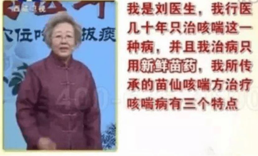 到了甘肃卫视,她又摇身一变,成了高级营养师兼著名中医养生保健专家,宣扬天山雪莲能包治百病。 可笑的是,就在同一个电视台,另一个时间段,刘洪斌换了身衣服,又卖起了苗医鲜药。不过这次她又多了一个更加唬人的头衔——中华中医医学会镇咳副会长兼东方咳嗽研究院副院长。