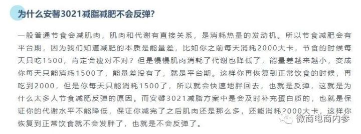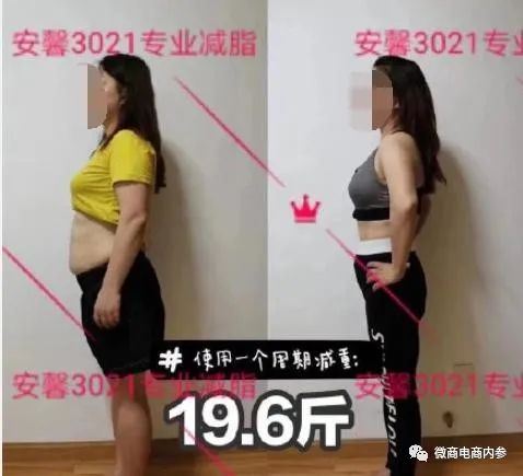 此举背后的意图恐怕只有网站管理者才真正心知肚明,毕竟这么大的一家微商企业,修改官网中的文字表述总不可能是因为在数据方面弄虚作假这种原因吧?况且,如果GMV(销售额+取消订单金额+拒收订单金额+退货订单金额)真的突破了12亿元的大关,那么这家企业也一定会成为当地的纳税大户,更不可能在业绩数据的收集方面犯下这样的低级错误。 减肥功效,真相几何 最近两年,打着减肥等旗号在微商渠道中违规宣传的普通食品并不少见,微商渠道上种种乱象也随着媒体的曝光而越来越受到外界关注。那么,声名在外的安馨3021方案内的产品又是否也是其中的一分子呢?