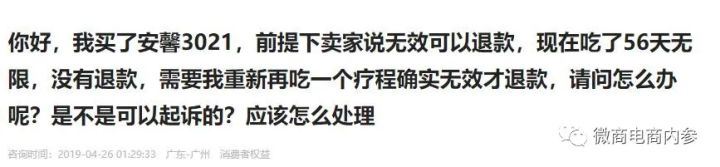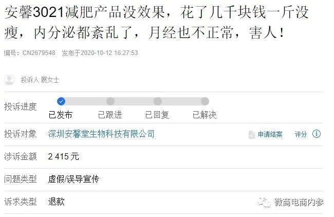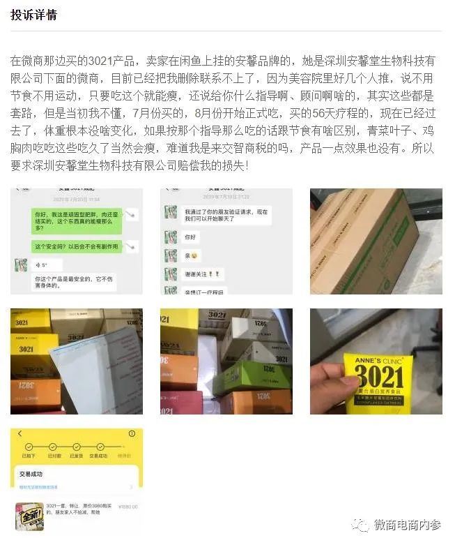 当然,如果把所谓的安馨3021归类为与安馨食品毫无关系的节食减肥法或者生酮减肥法,那就另当别论了,但如果说,在采用这种方法号召别人减肥的同时,还要推销安馨旗下的普通食品并予以销售,那产品销售方恐怕就并非一尘不染了。 投诉问题,质疑之声 2020年10月,展女士在聚投诉平台上投诉安馨3021减肥产品没效果,花了几千块钱一斤没瘦,内分泌都紊乱了,月经也不正常,害人!,具体内容为:在微商那边买的3021产品,卖家在闲鱼上挂的安馨品牌的,她是深圳安馨堂生物科技有限公司下面的微商,目前已经把我删除联系不上了,因为美容院里好几个人推,说不用节食不用运动,只要吃这个就能瘦,还说给你什么指导啊、顾问啊啥的,其实这些都是套路,但是当初我不懂,7月份买的,8月份开始正式吃,买的56天疗程的,现在已经过去了,体重根本没啥变化,如果按那个指导那么吃的话跟节食有啥区别,青菜叶子、鸡胸肉吃吃这些吃久了当然会瘦,难道我是来交智商税的吗,产品一点效果也没有。所以展女士要求深圳安馨堂生物科技有限公司赔偿其