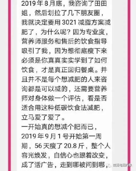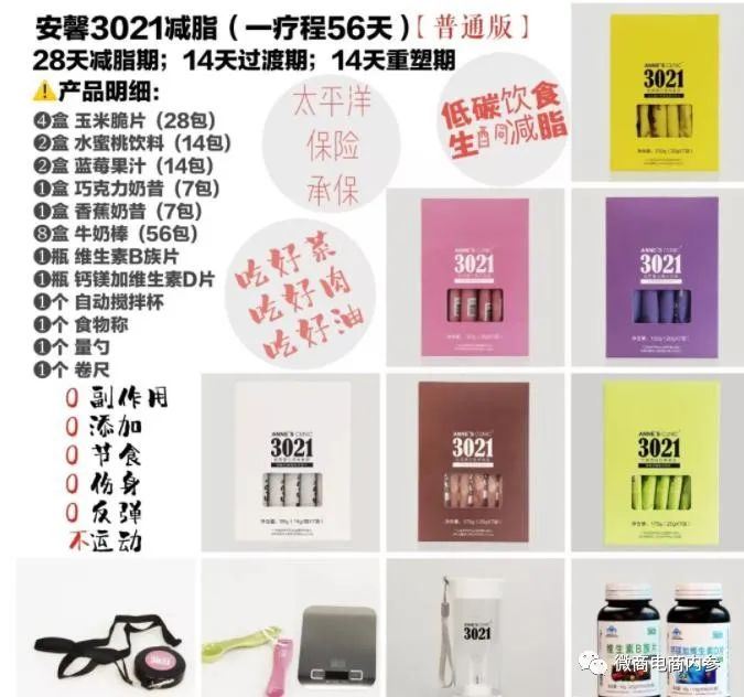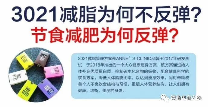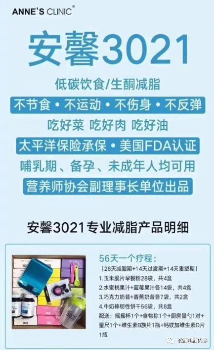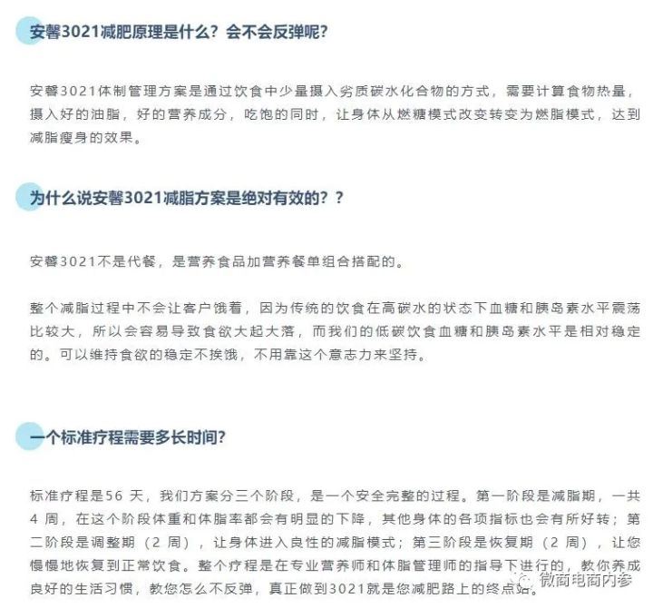 按照公众号安馨3021陶姐减脂营的说法,安馨3021其实就是一种饮食减肥法,通过调整日常的饮食结构,以较少碳水化合物的摄入就可以达到减肥的目的。公众号清荷食养的解读也无外其中:3021减脂是给顾客一整套饮食搭配方案(3021产品+降一日四餐,加营养师一对一服务)。