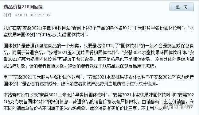 药品价格315网也曾不止一次地接受过网友关于该产品的咨询,并回复道:安馨 3021的商标注册信息对应的商品/服务为软饮料; 大豆为主的饮料(非牛奶替代品); 乳清饮料; 植物饮料; 富含蛋白质的运动饮料; 果昔; 乳酸饮料(果制品,非奶); 低卡路里软饮料; 姜汁饮料; 蔬菜汁(饮料)。固体饮料是普通预包装食品的一个分类,只要是名称中写了固体饮料的一般不会是药品或保健食品,而属于普通食品。安馨3021玉米脆片早餐粉固体饮料、安馨3021水蜜桃果味固体饮料和安馨3021巧克力奶昔固体饮料可能属于普通食品,既不是药品也不是保健食品,没有具体的保健功能或治疗功效,请消费者谨慎选择。建议消费者选择正规药品或保健食品用于减肥。