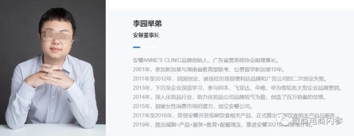 据官网介绍,这是一家国内首批专注于女性护理领域的品牌企业,低碳降饮食方式倡导者。公司秉承以行医的态度做产品的企业核心理念,匠心打造大降产业生态圈,品牌旗下包括女性护理、护肤等系列产品,由内而外全方位守护女性降;安馨3021体脂管理、安馨轻食项目,将降饮食理念带给千家万户。安馨期望以医疗态度的高标准,严格把控产品质量,用自然科学的力量为每一位消费者提供安全、有效、降的产品。 关于李园举弟,结合多方资料介绍,此人花名炮爷,为安馨品牌创始人,1988年1月出生,湖南株洲人。著名品牌操盘手,快粉微商实战训练营创始人、导师,极欧商学院特邀讲师,新媒体营销、微信引流高手。海外学习生活长达10年(也有资料显示留学新加坡10年),曾一度服务包括冈本,飞亚达,朵唯,华为等知名品牌,担任营销策划要职。