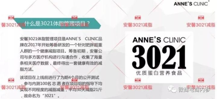 2018年3月,安馨3021体脂管理项目正式上市并发布,该项目的启动标志着安馨开始向体重管理领域深入拓展。据介绍,安馨3021体脂管理项目是ANNE`S CLINIC品牌在2017年开始筹备研发的一个针对肥胖超重人群的降减脂项目。筹备初期,安馨公司与多方医疗机构进行沟通合作,收集了海量条相关医疗数据,最终得出一套降有效的减脂方法。该项目在上线前进行了为期4个月的公开测试,参与内测的近100名志愿者在项目组的指导下均实现不同程度的减脂减重,平均30天减脂21斤,故命名为3021。现已帮助近万名亚降超重成人成功减脂减重。
