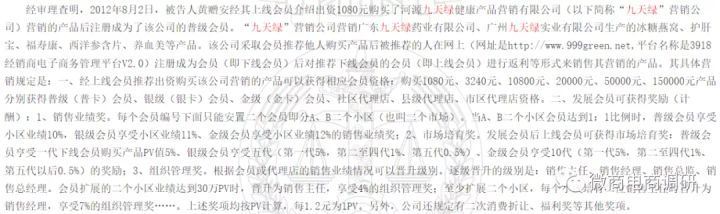 涉传风波,文书为证 近年来,关于九天绿涉传的质疑之声在网上声势渐盛。而关于九天绿涉嫌传销的证据,在中国裁判文书网上也确有所体现。据黄赠安组织、领导传销活动一审刑事判决书显示,龙南县人民检察院指控,广东九天绿药业有限公司以购买商品的名义缴纳相应费用后可获得相应的会员资格,每个会员可发展会员形成层级关系,并设置组织管理奖等计酬方式。2012年8月,黄赠安经人介绍出资1080元购买了该公司产品后,注册成为公司普卡;后又出资9720元购买产品升级为金卡。次月,该公司将黄赠安提升为龙南片区的销售主任。期间,黄赠安每月领取公司固定管理工资一千五百元,实际领扰个月共计一万三千多元,同时还领取销售业绩奖、市场培育奖共计一万两千多元及销售主任按市场业绩4%计算的组织管理奖共计两千七百多元。在组织、领导该传销活动中,黄赠安直接发展会员及由会员发展会员并安排在其名下的会员累计接近一百二十人,层级达到二十级。据此,公诉机关认为黄赠安的行为构成组织、领导传销活动罪。