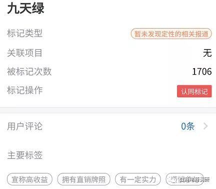 眼下,在腾讯灵鲲金融风险监管平台当中,九天绿这个关键词已经被标记了1706次,虽然标记类型是暂未发现定性的相关报道,不过其主要标签有宣称高收益的字样。