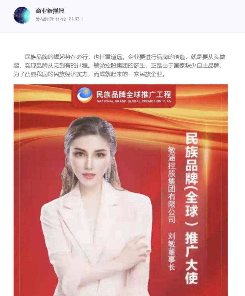3、敏涵控股称招商政策属于讨论版本,已经作废,属于未实行的。果真如此吗?清扬君撰写的文章就是针对敏涵控股2021年10月14日发布的关于近日网上诋毁敏涵控股集团不实报道的严正声明。在该严正声明中,敏涵控股并未提及招商政策属于讨论版本,已经作废,属于未实行的。难道就因为清扬君的文章,招商政策变成了废纸。如果真是讨论版本,还用盖章吗?此地无银三百两啊! 实际上,敏涵控股的说法和做法恰恰相反。 在严正声明中,敏涵控股一边辟谣,一边称今后,敏涵控股集团将诚挚接受来自政府、媒体、合作伙伴、消费者等方面的监管和监督,努力把‘敏涵’品牌打造成为知名的民族品牌。但却并没有接受媒体的监督,而是不断的举报相关文章。如此表里不一的行为,又怎么能扛起民族大旗,做民族品牌全球推广大使岂能让人心悦诚服? 或许是清扬君孤陋寡闻,不知道本文图片中的民族品牌(全球)推广工程究竟是什么机构,竟然能够授予刘敏董事长推广大使之殊荣。这不会也是一个野鸡机构吧?难不成,这和6万元就可以举行香港股交中心挂牌仪式一样,只是为了企业宣传造势!但这样的企业真的能代表民族企业吗?民族企业需要花钱买虚假的荣誉和光环吗? 文章来源:清扬君, 特此鸣谢f权归原作者所有,如有侵权请联系删除! |