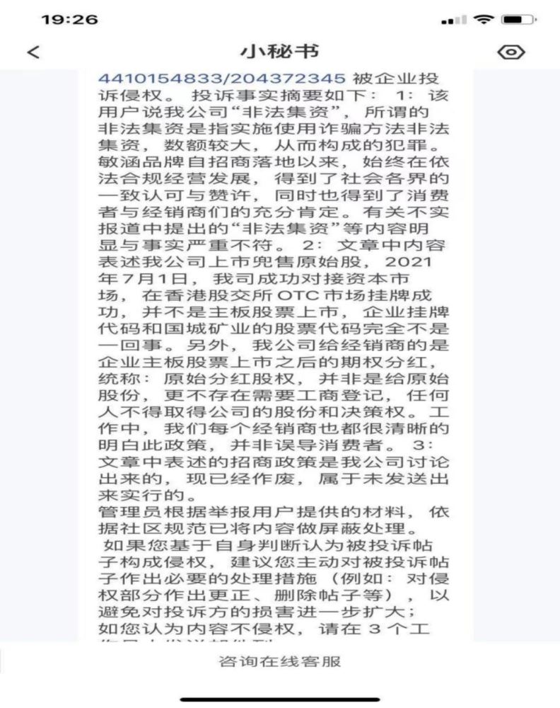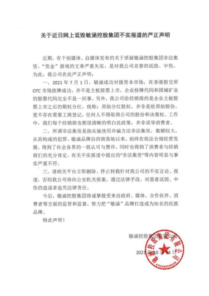 2021年12月6日,清扬君收到某自媒体平台的信息,提醒敏涵控股声明自相矛盾 原始股分红岂能随意解读一文遭到投诉,被投诉理由如下: 1、该用户说我公司非法集资,所谓的非法集资是指实施使用诈骗方法非法集资,数额较大,从而构成的犯罪。敏涵品牌自招商落地以来,始终在依法合规经营发展,得到了社会各界的一致认可与赞许,同时也得到了消费者与经销商们的充分肯定。有关不实报道中提出的非法集资等内容明显与事实严重不符。 2、文章中内容表述我公司上市兜售原始股,2021年7月1日,我司成功对接资本市场,在香港股交所OTC市场挂牌成功,并不是主板股票上市,企业挂牌代码和国城矿业的股票代码完全不是一回事。另外,我公司给经销商的是企业主板股票上市之后的期权分红,统称:原始分红股权,并非是给原始股份,更不存在需要工商登记,任何人不得取得公司的股份和决策权。工作中,我们每个经销商也都很清晰的明白此政策,并非误导消费者。 3、文章中表述的招商政策是我公司讨论出来的,现已经作废,属于未发送出来实行的。 对于敏涵控股,或许很多人并不了解。清扬君借助于公开报道,帮大家快速认识一下。 据11月18日商业新播报报道,由于国家缺少自主品牌,敏涵控股集团应运而生。敏涵控股集团的刘敏董事长把长远的品牌战略与当下的国民经济相结合,提出了分享经济同时也制定出相关政策,共同富裕理念。2021年7月1日,在伟大中国共产党诞辰100周年之际,敏涵控股集团在中国商丘成功举办香港股交中心挂牌仪式。根据中华人民共和国资产评估法、国家标准,敏涵品牌价值达到280.08亿元,并在第16届亚洲品牌盛典上,敏涵成功入选2021亚洲品牌500强,这是品牌强国,走出国门享誉世界的第一步。对于敏涵品牌的创始人刘敏董事长来说,做慈善成为慈善家是她的核心追求,企业带来的经济效益也固然重要,相比培养一个世界级民族品牌所带来的其意义已经超越了获拳济利益本身。品牌已经成为一种生活方式和思维方式,著名的本土品牌会让国家和民族引以为傲。 同时,该文章还有敏涵控股集团的刘敏董事长民族品牌全球推广大使的宣传海报。