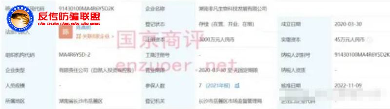 据悉,湖南非凡生物科技发展有限公司成立于2020年,注册地为长沙市岳麓区,法人代表陈高明,注册资本3000万,实际缴纳45万元,股东为陈高明、蒋世豪、长沙市澳思廷企业管理咨询有限公司、成都非凡生物高新科技有限公司、湖南麦通资产管理有限公司与湖南超然工程建设有限公司。据其官方对外宣传主要运营人员为陈高明、汪力、蒋世豪、李雨锶等。