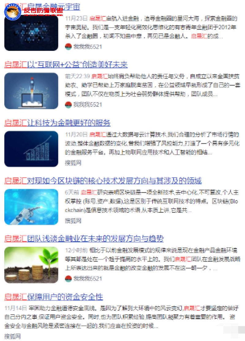现在,越来越多的资金盘打着慈善旗号来圈钱了,刚刚跑路的善德馨,同义汇,起点俱乐部,都是这种类型的盘子,今天要说的是启晟汇这个平台,又是打着慈善的幌子,且很多地方造假,下面就来扒一扒。 宣传资料显示,启晟汇成立于2012年10月21日,自成立以来一直秉承着团结、尊重帮持、互爱的核心理念投身于互联网行业,是一支行走在互联网前端的精英团队。 又是包装成很早就成立的组织,但从网上的宣传记录来看,时间最早是今年的5月份,而最近又花钱在各大媒体做了宣传。