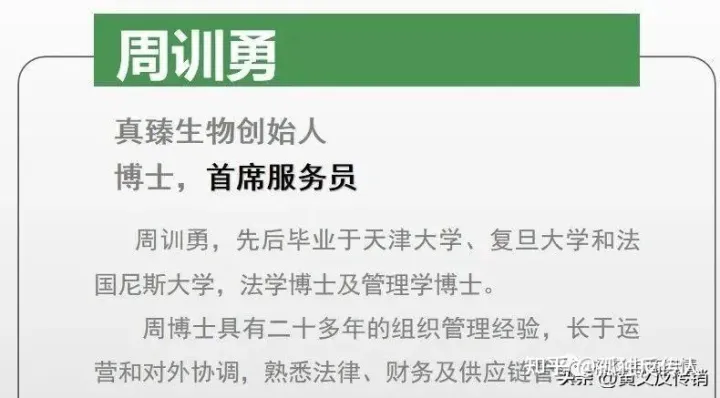 据相关行政处罚决定书显示如下:2020年3月30日,有关部门收到消费者的投诉举报,反映在京东1号店购物平台上真臻食品专营店购买了由当事人生产经营的牡蛎蛹虫草黄精压片糖果,标签标识标注的食用量和不适宜人群不符合食品安全法的相关规定。另查,当事人在京东1号店购物平台上真臻食品专营店对其商品的性能、功能等作虚假和引人误解的商业宣传,欺骗、误导消费者。 当事人的上述行为违反了我国反不正当竞争法第八条和我国食品安全法第六十七条第三款的规定。依据食品安全法第一百二十五条第一款第二项和行政处罚法第二十七条第一款第(一)项的规定,有关监管部门决定对当事人给予以下行政处罚:1、没收违法产品牡蛎蛹虫草黄精压片糖果478瓶,销毁处理;2、没收违法所得1364元;3、罚款人民币20000元。 而事实上,上述处罚事件也并非个例,早在2020年年初,真臻(宿迁)生物科技有限公司旗下的全资子公司真臻(北京)生物科技有限公司也遭到过有关部门的处罚。据有关处罚决定书显示,真臻(北京)生物科技有限公司于2019年9月10日在其官方微博臻象内发布了一篇情暖中秋,月满人心真臻生物关爱残疾人中秋送温暖的文章,该文章内宣称自己是真臻生物科技集团,经核实真臻生物科技集团没有注册。当事人主动承认违法事实,并于2019年10月8日,对上述文章进行了整改。截至整改时,该微博有粉丝47人,文章阅读量是169次。 北京市丰台区市场监督管理局于2020年1月20日向当事人送达了不予行政处罚告知书,告知当事人该局决定作出行政处罚决定的事实、理由、依据、内容以及当事人依法享有的陈述权、申辩权。当事人在法定期限内未提出陈述、申辩意见。 或许正因为这则处罚的出现,才让如今一些宣传材料在写到真臻生物科技集团时,还要在其后面再加一个(筹)。 当时间来到2021年5月12日时,该公司又因通过登记的住所或者经营场所无法联系,而被北京市大兴区市场监督管理局列入企业经营异常名录,且至今未被移除。 至于真臻生物科技集团创始人、董事长兼CEO周训勇本人,据官方材料介绍,周训勇先后毕业于天津大学、复旦大学和法国尼斯大学,是法学博士及管理学博士,具有二十多年的组织管理经验,长于运营和对外协调,熟悉法律、财务及供应链管理。2013年后转到生物学,致力于酶学研究及酶制剂的开发。