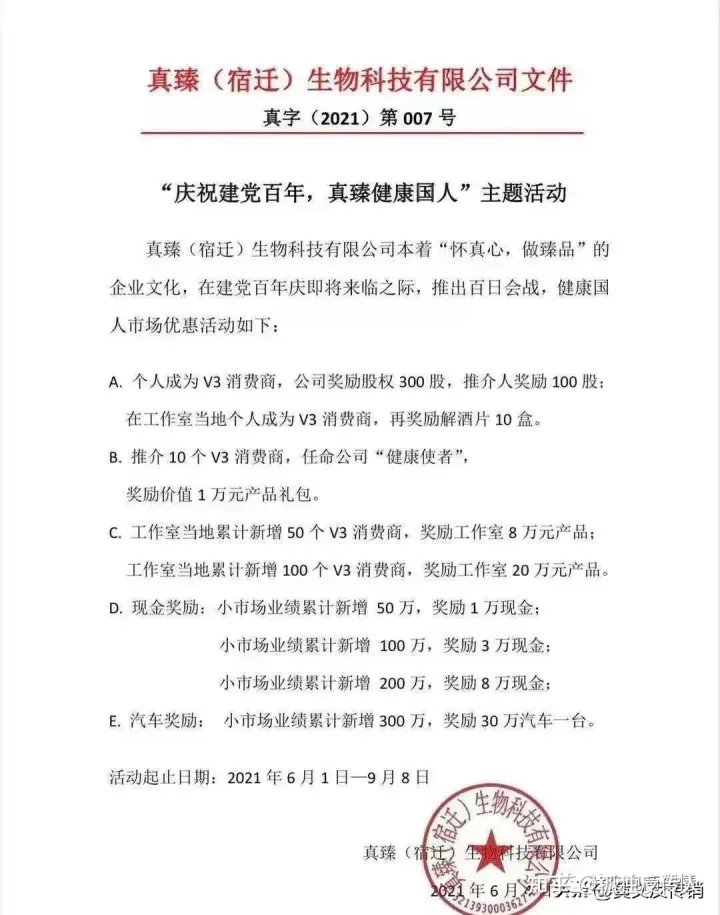 归根结底,投资者只有在上海证券交易所、深圳证券交易所以及承担新三板交易结算的全国中小企业股份转让系统这三个公开市场买卖股票,才不存在诈骗风险,而企业与投资人之间非法进行的所谓的原始股权转让、买卖的行为,不符合相关法律规定,参与此类非上市公司违规股权转让交易的投资者的权益,难以受到法律保护,在法律上也并没有原始股的概念。近年来层出不穷的原始股骗局具有隐蔽性强、手法多样等特点,投资者在购买非上市公司的股票时,一定要增强风险意识,不要轻信非法个人和机构的各类骗人把戏,不要心存侥幸。 对于上述制度,本平台联系到了行业专家对其进行了解读:这个制度总拨比设计得还算不错,总拨比是62。第一,消费1360一单,一次性消费1万和1万5,只是多送了所谓的积分,也叫臻珠,但是1万、1万5和1360这些数字不成倍数关系,所以这份制度在这个部分说得很含糊。 第二,销售奖说是30%,按商务部说的,总拨比不能超30%,但是基本没有一个不超过30%。 第三,领导奖,这个公司实际上是弄了个小区概念,它的小区并不是双轨,也就是说,小区的业绩累加起来可能远远超过所谓的大区的业绩,甚至超过很多倍,然后他的领导奖,属于玩数字游戏,看似比例很高,实际是用小零售奖作为计算基数的,比方领导奖最高30%,实际是30%的30%。 第四,协同奖,这个奖金就是拿上级的奖金,和权健刚开始起盘的套路差不多,靠人头凑数的概念略显突出,这个地方就证明这个制度设计者的思维是混乱的,这个字面上就有拉人头的意味。 第五,至于股权,按证券市场监管条例,卖股权需要完成1200万的经营流水之后,才能进行相关的注册登记,申请卖股权。正常来讲,不是公司刚启动的时候就可以往外卖股权,单就这一项而言,这份制度就是违法的,卖股权也得有依据,同时,行业内没有谁是把股权收益给兑现了的。 第六,一些推广人员所谓的政府投资,其实是代表政府投资的公司控股的一个公司来投资的,如果真臻现在就开始卖股权,而且还是监管部门允许的话,那就出笑话了。 至于以为降,更为家人的发展理念!集团力争10年内服务300万中国家庭,实现300亿元营收规模,打造中国系统食疗服务第一品牌的目标!第3年起开展筹备上市,5年内(2023年)完成上市的愿景。在2023年1月30日宿迁市洋河新区洋河镇人民政府发布的洋河新区洋河镇人民政府行政处罚听证公告看来,这一切就显得尤为滑稽可笑了。 |