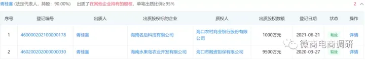 据企查查显示,在2021年6月29日,三亚玫瑰谷爱唯实业有限公司的所有股权被股东两次出质,出质股权数额为500万元,质权人为海南农村商业银行股份有限公司。