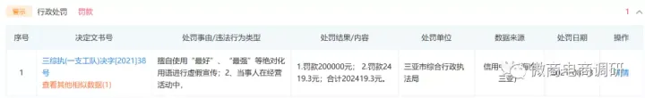 值得关注的是,我们从企查查也了解到,名后隶属于三亚玫瑰谷爱唯实业有限公司,该公司也曾因为在产品宣传时擅自使用最好、最强等绝对化用语进行虚假宣传受到行政处罚。