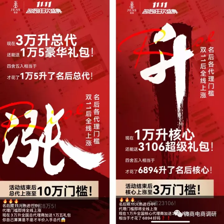 另外,我们从名后总代理小红(化名)了解到,名后在双十一期间,还有代理门槛降低的活动出现,3万即可升级为全国总代还加送1.5万的豪华礼包;1万即可升级为核心代理还加送3106元的超级礼包。双十一结束后,代理门槛总代涨至10万,核心代理涨至3万。