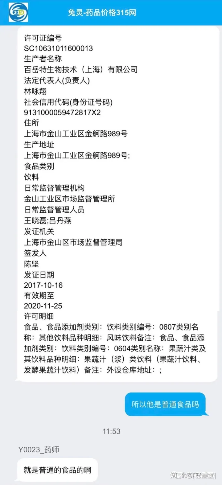 经销商小刘表示,这款燕窝饮属于保健品备案,然而当我们在国家市场监督管理总局的保健食品备案信息处查询时,却并没有找到有关该燕窝饮的信息。最后,经过调查我们得知,这款燕窝饮的生产许可证号为SC10631011600013,生产企业为百岳特生物技术(上海)有限公司。