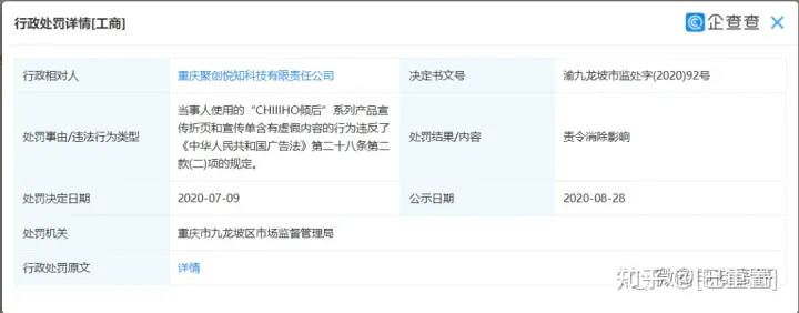 而倾后也最终因宣传问题遭到了当地市场监督管理局作出的行政处罚:2020年7月,重庆聚创悦知科技有限责任公司因使用的CHIIIHO倾后系列产品宣传折页和宣传单含有虚假内容的行为,违反了中华人民共和国广告法第二十八条第二款(二)项的规定,责令当事人消除影响。