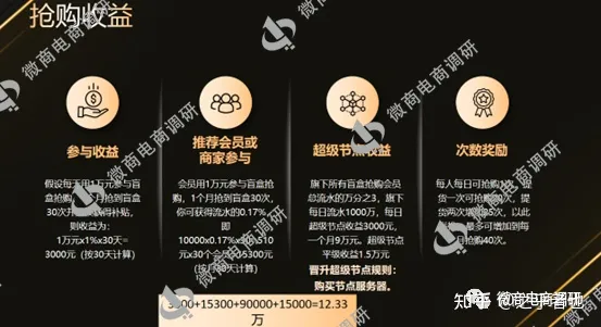 在此过程中产生的抢购收益,具体可以分为参与收益、推广收益、超级节点收益和次数奖励四大板块。