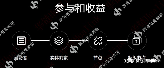 当下,华链店商的参与者被分为消费者、实体商家、节点和代理商等四个级别。