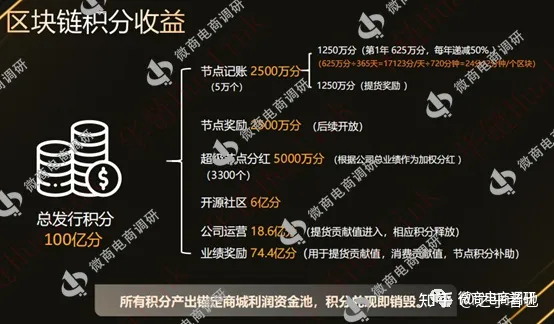 文章的最后,我们再来了解一下华链店商将给予参与者的区块链积分收益又是怎么一回事。据相关PPT资料显示,华链积分恒定、恒量发行100亿积分,分配机制和销毁机制颇有些虚拟币的意味。
