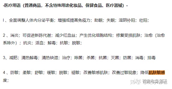 实际上,该产品的备案编号为川G妆网备字2019004021,同样属于国产非特殊用途化妆品,而改善剪敏感的广告语,很可能让消费者误以为该产品具有抗敏、舒敏等医疗作用。 根据化妆品标识管理规定、化妆品命名规定、化妆品命名指南等文件要求,化妆品宣称用语应根据其语言环境来确定,禁止表达的词意或使用的词语包括但不限于以下词语:医疗术语、明示或暗示医疗作用和效果的词语。如处方、药用、治疗、解毒、抗敏、除菌、无斑、祛疤、生发、溶脂、瘦身及各类皮肤病名称、各种疾病名称等。显然,改善剪敏感并不是化妆品具有的功效,超出了化妆品定义,属于超范围宣传和宣传医疗作用。 现如今,在一些平台发布的违禁词榜单中,类似的广告用语已然榜上有名。