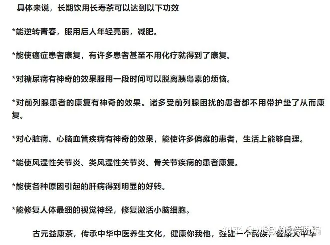 还有代理商宣称古元益康茶能够健壮筋骨(风湿、类风湿、骨质疏松、软骨、骨膜、滑膜、关节),提高免疫力,延缓机体衰老(恢复心、肝、肺、肾功能至年轻壮态、提高性能力、恢复年轻时皮肤弹性、厚度和脸型),修复受损组织(胃肠粘膜、鼻黏膜、口腔黏膜、食道粘膜、眼角膜、视网膜、虹膜),修复多种肝损伤,改善心脑血管(冠心病),促进造血(贫血),促进代谢(糖尿病、痛风),调节内分泌紊乱(更年期,月经不调)抑郁症及术后,癌症化疗体力体能的恢复,无抗原性,无副作用,无糖配方,营养全面均衡功能独特,它参与人体一切功能性疾病的治疗,是所有药物都不能与其相比的……