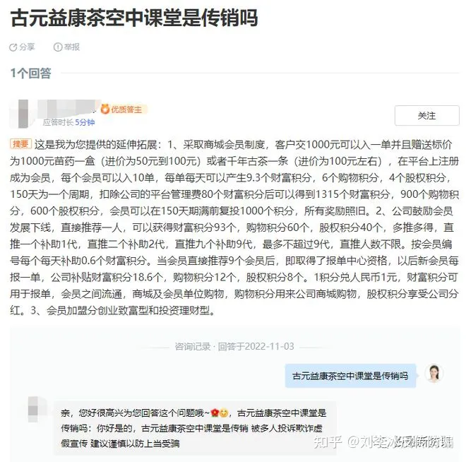 今年11月3日,在百度的问一问平台,有用户曾询问古元益康茶空中课堂是传销吗?得到的回答是古元益康茶空中课堂是传销,被多人投诉欺诈虚假宣传,建议谨慎以防上当受骗。