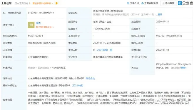 据企查查显示,青岛仁克诺生物工程有限公司成立于2020年7月15日,位于山东省青岛市黄岛区世贸悦海13号楼2209,所属行业为医药制造业,注册资本1000万,实缴0元,法人代表周杰任执行董事兼经理,持股100%。