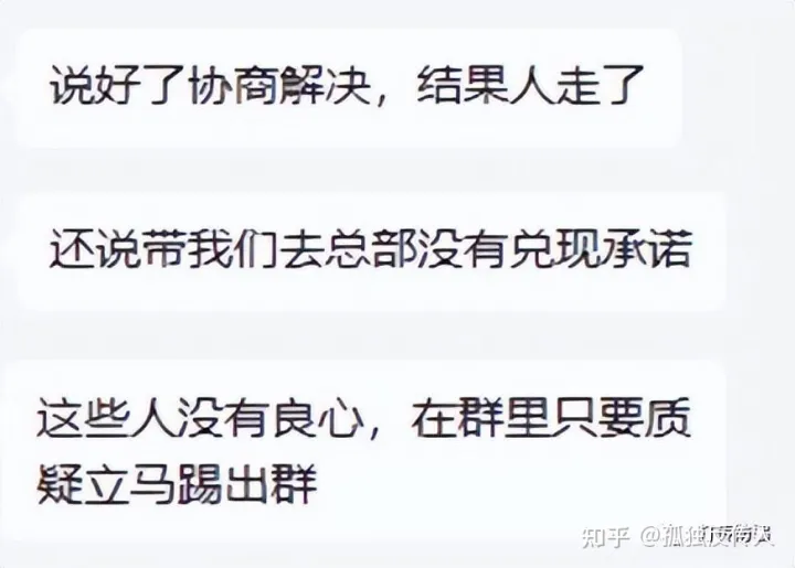 最新情况: 这几日,该网友同数名受害者正与团队长协商解决问题,说好可以提现的承诺成了一句空话,就连承诺去公司总部的事情也没有兑现。而且群里一旦有质疑者,都将被踢出群聊。