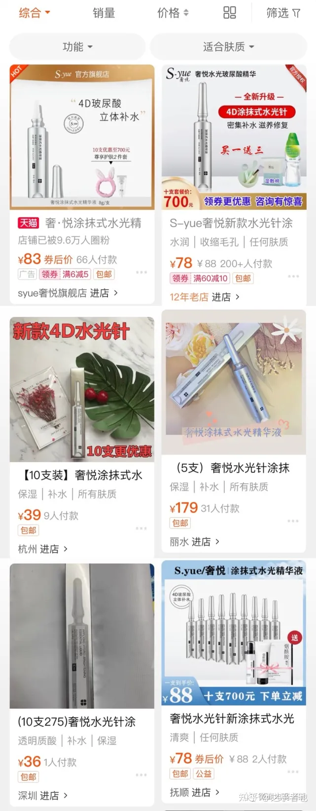 当我们在淘宝等购物平台搜索奢悦的相关产品时发现,同一件产品的价格参差不齐,微商清货等字眼频频出现,由此可见,乱价现象已经出现在奢悦的经销团队。
