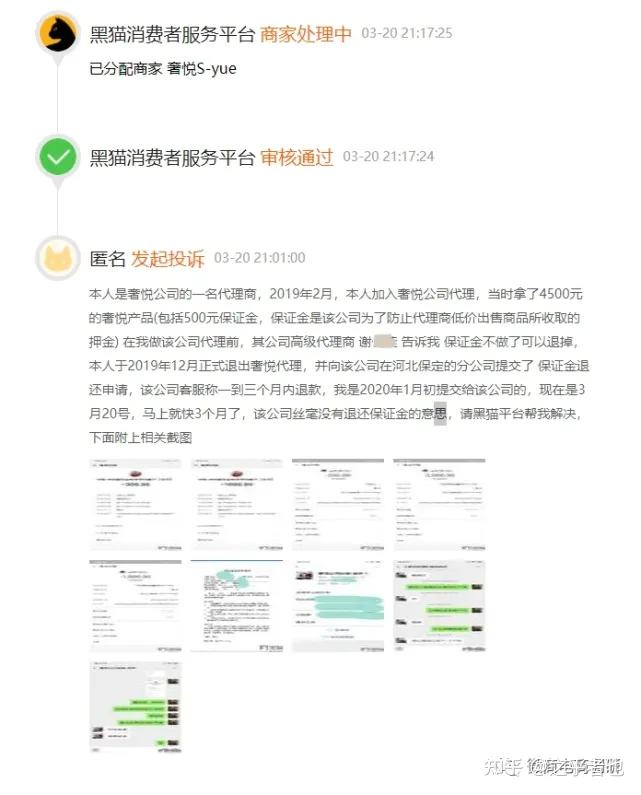紧接着在2018年10月,奢悦(北京)生物科技有限公司发出关于奢悦公司取消张亚敏经销商资格公告,表明经销商张亚敏因违反奢悦公司经销商管理制度及涉嫌挪用其他经销商货款,取消其经销授权资格,且张亚敏所有销售行为均与奢悦公司无关,所销售的任何产品,奢悦公司均不保证其品质和来源。也就是说,被告公司已无权经销奢悦S-yue品牌产品,那么原告与被告之前签订的商品销售代理合同的合同目的就不能实现,于是最后由被告返还剩余货款相对应的金额结案。 除此之外,奢悦还因退还保证金问题遭到不少投诉。在黑猫投诉平台上,有消费者表示,自己是奢悦的一名代理商,2019年2月拿了4500元的奢悦产品成为了代理,其中包括500元的保证金,保证金是公司为了防止代理商低价出售商品所收取的押金,而当时公司的上级经销商说如果不做了保证金可以退掉,自己在2019年12月正式退出奢悦的代理,并向公司提交了保证金退还申请,当时公司的客服说一到三个月内退款,现在就快三个月了,公司丝毫没有要退还保证金的意思。