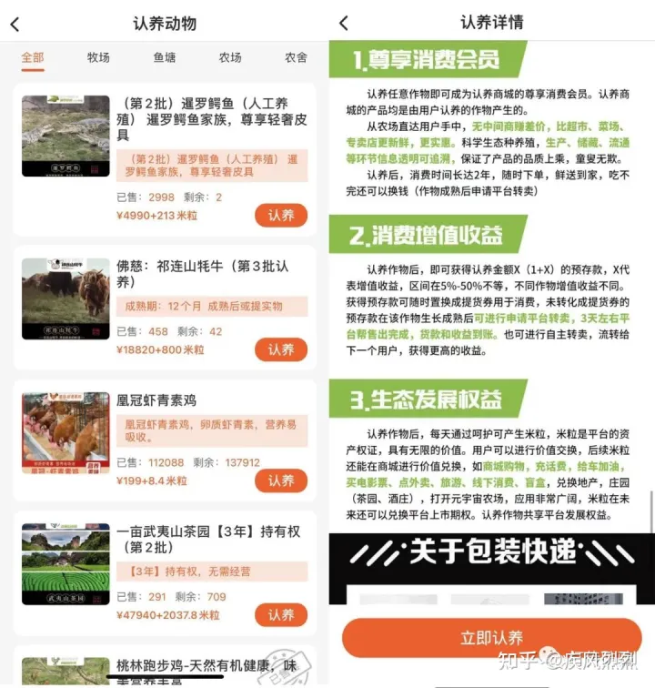 在销销乐项目之后,该网友认养了掌商惠APP中云放牧场的动物,认养详情如下: 1.尊享消费会员 认养任意作物即可成为认养商城的尊享消费会员。认养商城的产品均是由用户认养的作物产生的。从农场直达用户手中,无中间商赚差价,比超市、菜场、专卖店更新鲜,更实惠。科学生态种养殖,生产、储藏、流通等环节信息透明可追溯,保证了产品的品质上乘,童叟无欺。认养后,消费时间长达2年,随时下单,鲜送到家,吃不完还可以换钱(作物成熟后申请平台转卖) 2消费增值收益 认养作物后,即可获得认养金额X (1+X)的预存款,X代表增值收益,区间在5%-50%不等,不同作物增值收益不同。获得预存款可随时置换成提货券用于消费,未转化成提货券的预存款在该作物生长成熟后可进行申请平台转卖,3天左右平台帮售出完成,货款和收益到账。也可进行自主转卖,流转给下一个用户,获得更高的收益。 3.生态发展权益 认养作物后,每天通过呵护可产生米粒,米粒是平台的资产权证,具有无限的价值。用户可以进行价值交换,后续米粒还能在商城进行价值兑换,如商城购物,充话费,给车加油,买电影票、点外卖、旅游、线下消费、盲盒,兑换地产,庄园(茶园、酒庄),打开元宇审农场,应用非常广阔,米粒在未来还可以兑换平台上市期权。认养作物共享平台发展权益。 认养动物得米粒,米粒可用于掌商惠app中爱转卖交易,也可养成熟后申请平台转卖、提实货,还可开通会员获得免广告、减免手续费、一键呵护的权益。据透露,米粒从去年11.3元一个到今年5块钱一个,可想而知价格也是由平台随意控制,这样一系列的操作用意也是显而易见的。同时平台也不能提现。