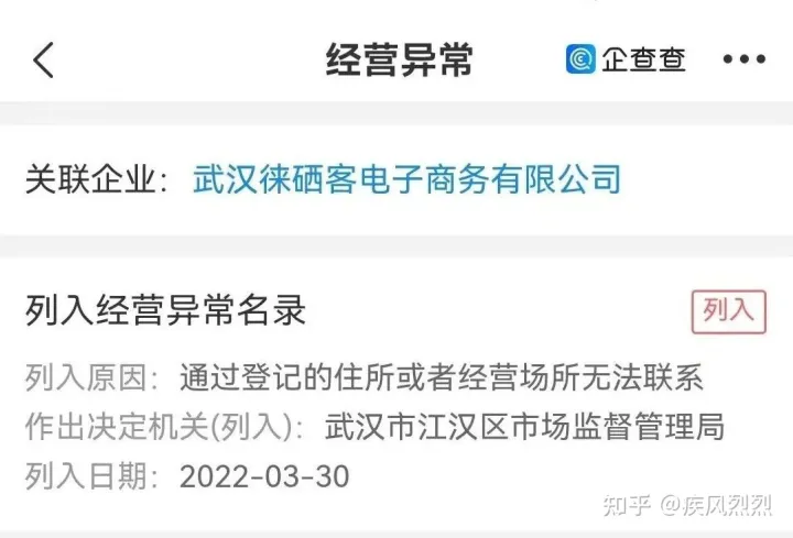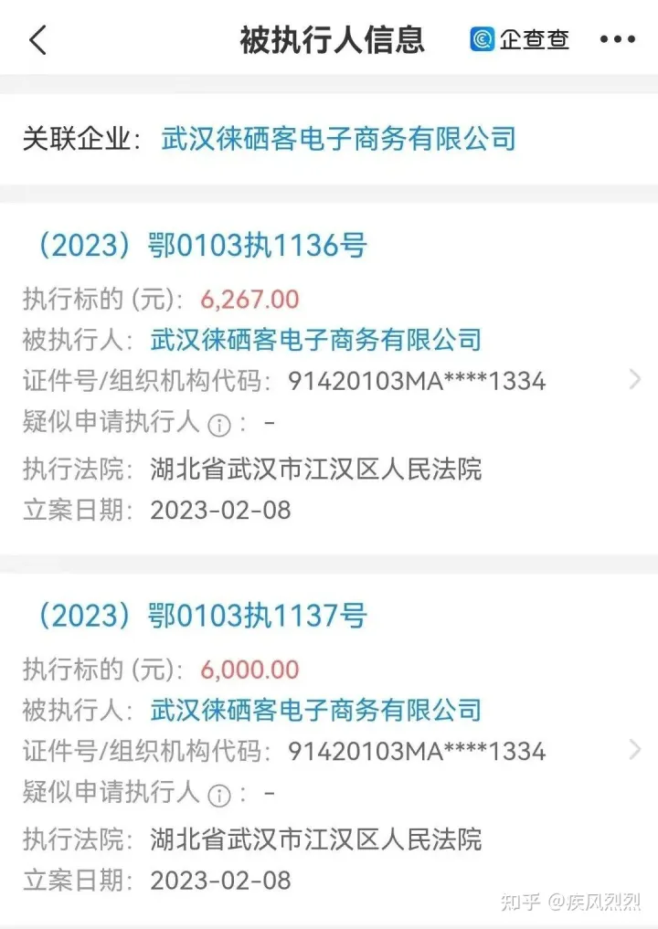 近日,据企查查APP数据显示,武汉徕硒客涉及两起执行案件,详情如下: 1、案号(2023)鄂0103执1136号,立案日期2023年2月8日,执行标的6267元,执行法院湖北省武汉市江汉区人民法院,被执行人武汉徕硒客电子商务有限公司; 2、案号(2023)鄂0103执1137号,立案日期2023年2月8日,执行标的6000元,执行法院湖北省武汉市江汉区人民法院,被执行人武汉徕硒客电子商务有限公司; 另外2022年3月30日,武汉徕硒客电子商务有限公司殷通过登记的住所或者经营场所无法联系被武汉市江汉区市场监督管理局列入异常。 至于武汉徕硒客成为被执行人和被列入异常的原因是什么,社交电商预警将持续关注报道。 本文由社交电商预警原创,未经允许请勿转载! |