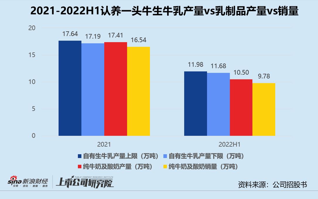 不仅超过一半的自有牧场是租赁而来,奶牛数量的增长也通过融资租赁完成。 2021年认养一头牛的生产性生物资产价值约为7.97亿元,较2020年同期大幅增长113.10%。截至2021年末公司共有37062头奶牛,平均奶牛价值约为每头2.15万元。 2021年2月和10月,康宏牧业和波波牧业以融资租赁方式分别租入价值3000万元、9740万元的奶牛。粗略推算两次共租得约5926头奶牛,占自有奶牛总数近16%。由于融资租赁获得奶牛的主要目标为眷满足生牛乳生产,因此租来的奶牛应多为成母牛,两批租赁奶牛数量占报告期内成母牛总数的43.67%。 又是借牧场又是借奶牛,认养一头牛的自有奶源产量究竟表现如何? 这一点在招股书中并没有详细说明,但按照自有牧场采购金额以及成本均价计算,2021和2022年1-6月的采购生牛乳分别约为14.85万吨、10.62万吨。 而2021年末认养一头牛的自有成母牛共有13569头,2022年前6个月成母牛为18431头。如果诚如公司所宣传,自有牧场的成母牛年均单产为12.67吨-13吨,两个报告期内自供生牛乳产量区间应该为17.19万吨-17.64万吨以及11.68万吨-11.98万吨,产量下限分别为采购量的1.16倍、1.10倍,理论上足以覆盖纯牛奶和酸奶当期的产量和销量。