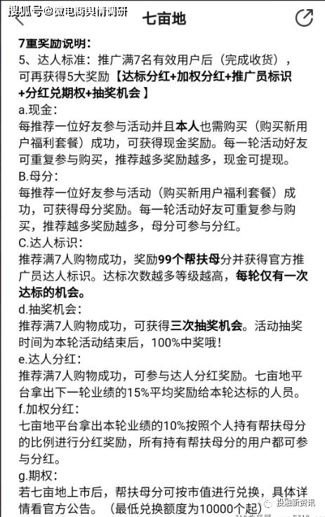 七亩地7重奖励说明: 达人标准:推广满7名有效用户后(完成收货)可再获得5大奖励达标分红+加权分红+推广员标识+分红兑期权+抽奖机会 a现金: 每推荐一位好友参与活动并且本人也需购买(购买新用户福利套餐)成功,可获得现金奖励。每一轮活动好友可重复参与购买,推荐越多奖励越多,现金可提现。 B.母分: 每推荐一位好友参与活动(购买新用户福利套餐)成功,可获得母分奖励。每一轮活动好友可重复参与购买,推荐越多奖励越多,母分可参与分红。 C.达人标识: 推荐满7人购物成功,奖励99个帮扶母分并获得官方推广员达人标识。达标次数越多等级越高,每轮仅有一次达标的机会。 d抽奖机会: 推荐满7人购物成功,可获得三次抽奖机会。活动抽奖时间为本轮活动结束后,100%中奖哦! e.达人分红: 推荐满7人购物成功,可参与达人分红奖励。七亩地平台拿出下一轮业绩的15%平均奖励给本轮达标的人员。 f加权分红: 七亩地平台拿出本轮业绩的10%按照个人持有帮扶母分的比例进行分红奖励,所有持有帮扶母分的用户都可参 与分红。 g期权: 若七亩地上市后,帮扶母分可按市值进行兑换,具体详情看官方公告。(最低兑换额度为10000个起)