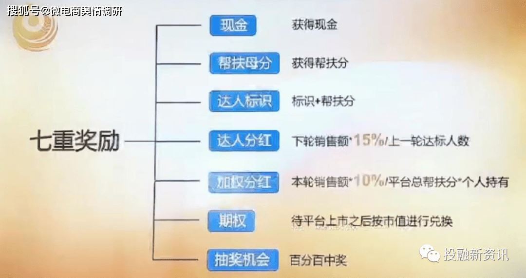 据推广资料显示,七亩地平台共设立了七重奖励:现金、帮扶母分、达人标识、达人分红、加权分红、期权、抽奖机会。