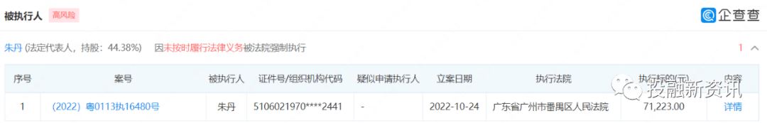 图片来源:企查查 值得一提的是,七亩地的法人代表朱丹在2022年10月24日曾因未按时履行法律义务被广东省广州市番禺区人民法院执行71223元。