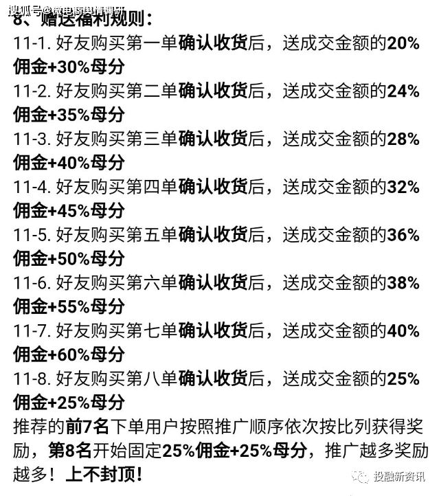 8、赠送福利规则: 11-1.好友购买第一单确认收货后,送成交金额的20%佣金+30%母分; 11-2.好友购买第二单确认收货后,送成交金额的24%佣金+35%母分; 11-3.好友购买第三单确认收货后,送成交金额的28%佣金+40%母分; 11-4.好友购买第四单确认收货后,送成交金额的32%佣金+45%母分; 11-5.好友购买第五单确认收货后,送成交金额的36%佣金+50%母分; 11-6.好友购买第六单确认收货后,送成交金额的38%佣金+55%母分; 11-7.好友购买第七单确认收货后,送成交金额的40%佣金+60%母分; 11-8.好友购买第八单确认收货后,送成交金额的25%佣金+25%母分。 推荐的前7名下单用户按照推广顺序依次按比列获得奖励,第8名开始固定25%佣金+25%母分,推广越多奖励越多!上不封顶! 从以上模式不难看出,广州七亩地科技公司旗下的七亩地平台的运营模式明显属于击鼓传花式的旁氏骗局,表面上看,只要不断地有人加入,购买产品最后都是赚的,但实际上,本质是通过发展下线,以下线缴纳的入门费层层返利,拿新投入者的钱去支付老投入者的奖励,一旦资金来源断裂,就会产生崩盘。 投融新资讯在此提醒广大投资者,投资需谨慎,七亩地平台所谓助力乡村振兴,共建美丽乡村为噱头的犹如水中月镜中花的躺赚项目,一旦平台关网跑路,后加入的用户只会血本无归,实质上该平台的始作俑者背景也无法保障你们的资金安全。 |