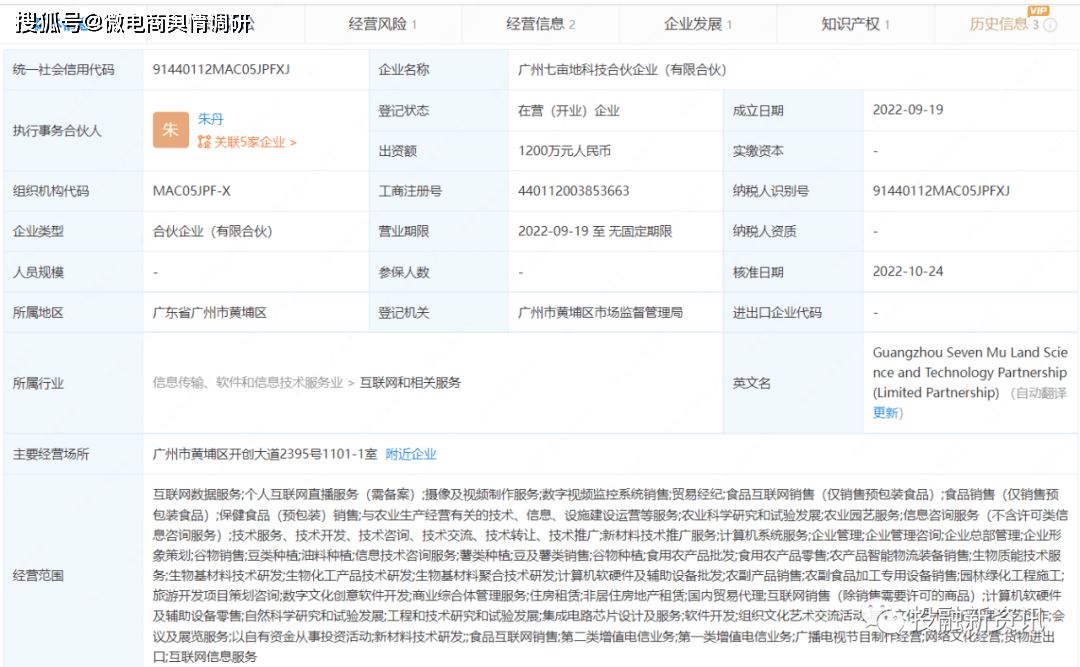 图片来源:企查查 据企查查显示,广州七亩地科技合伙企业(有限合伙)成立于2022年9月19日,位于广州市黄埔区开创大道2395号1101-1室,注册资本1200万,实缴不详,法人代表朱丹持股44.375%,为最大股东,李爱书持股29.5%。