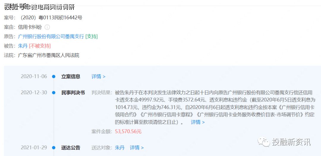 图片来源:企查查 据企查查公布的民事判决书显示,朱丹于2018年3月向广州银行申领了一张信用卡,在使用该卡过程中发生透支钱款并逾期严重,截止至2020年6月5日,尚欠广州银行本金49997.92元,手续费3572.64元,利息1014.73元,违约金暂计746.31元,共计人民币55331.6元。经广州银行多次催告,朱丹至今仍未清偿。