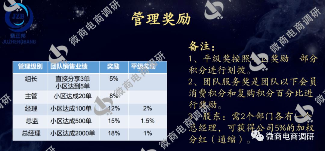 第三、管理奖励: 组长:直接分享3单/小区达成5单,奖励5% ; 主管:小区达成20单,奖励8%,; 经理:小区达成100单,奖励12%,平级奖2%; 总监:小区达成500单,奖励15%,平级奖1.5%; 总经理:小区达成2000单,奖励18%,平级奖1%。