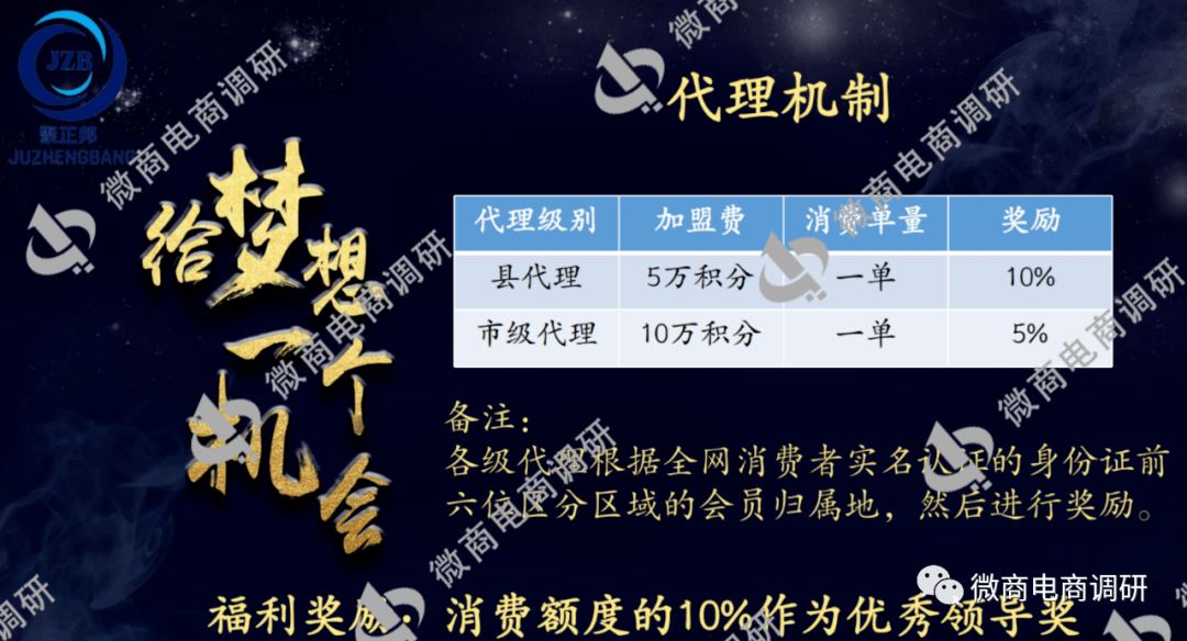 第四、代理机制: 县级代理:加盟积分5万、每单获得消费额度10%奖励; 市级代理:加盟积分10万、每单获得消费额度5%奖励; 福利奖励:消费额度的10%作为优秀领导奖。 备注:各级代理根据全网消费者实名认证的身份证前六位区分区域会员的归属地,然后进行奖励。