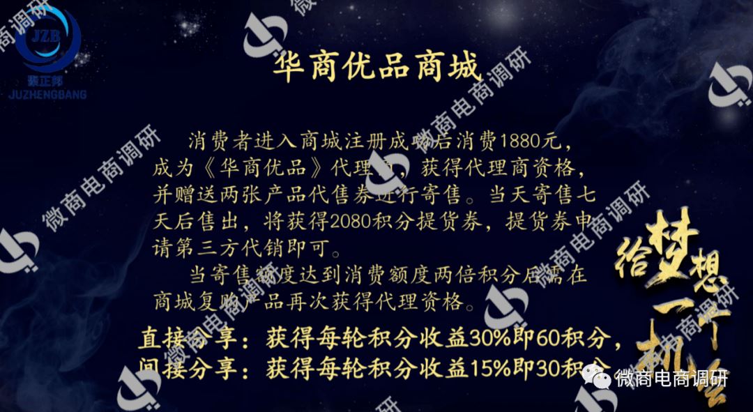 揭底模式有何收益? 最后,我们来了解一下华商优选的代理模式。据代理商发来的资料显示,华商优选推行积分管理机制: 第一、消费者进入商城注册成功后消费1880元,成为华商优品代理商,获得代理商资格,并赠送两张产品代售券进行寄售。当天寄售七天后售出,将获得2080积分提货券,提货券申请第三方代销即可。当寄售额度达到消费额度两倍积分后需在商城复购产品再次获得代理资格。 第二、直接分享:获得每轮积分收益30%即60积分;间接分享:获得每轮积分 收益15%即30积分。