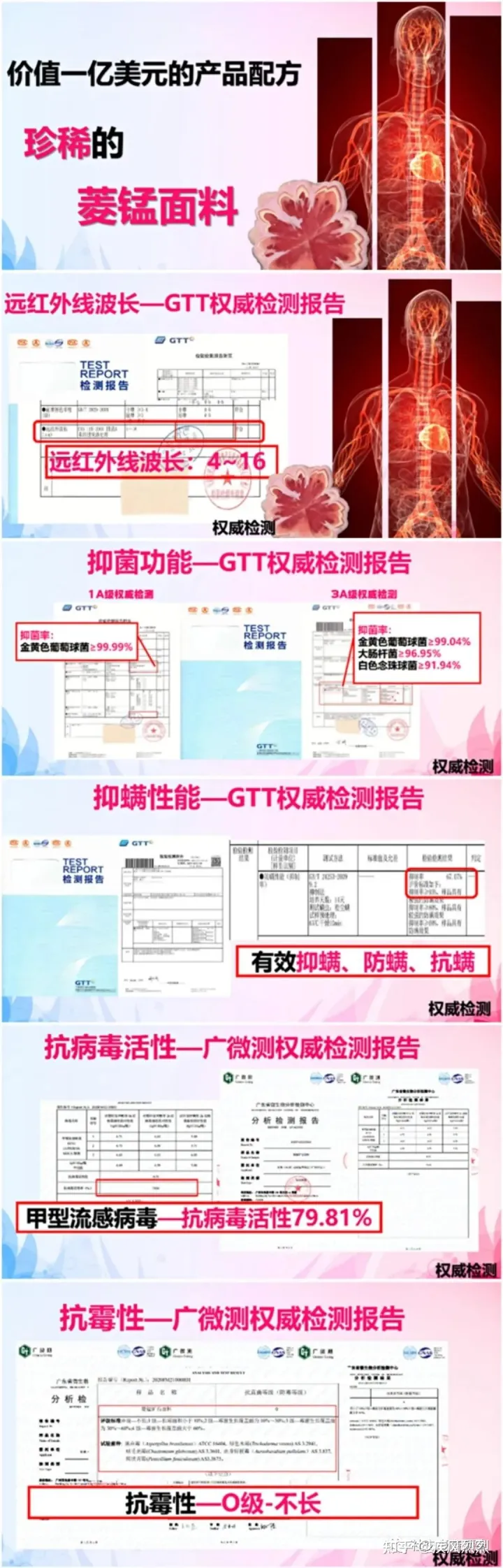 来源:简康产品优势(图片版)ppt 通过朱先生发过来的简康产品优势(图片版)ppt中发现,简康介绍到其产品中含有价值一亿美元的产品配方珍惜的菱锰面料和泉灵石,穿上它的产品不但可以减肥,而且乳腺问题,妇科问题,富贵包,脊椎等等问题都有不错的疗效。其中简康展示出了菱锰面料的五大权威检测报告: