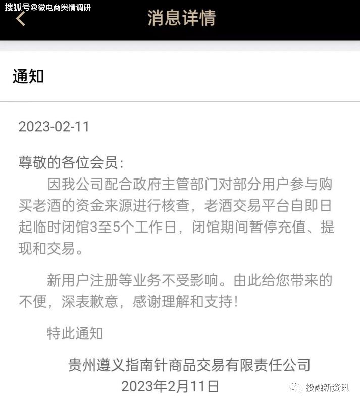 据这则发布于2月11日的通知显示,因我公司配合政府主管部门对部分用户参与购买老酒的资金来源进行核查,老酒交易平台自即日起临时闭馆3至5个工作日,闭馆期间暂停充值、提现和交易。