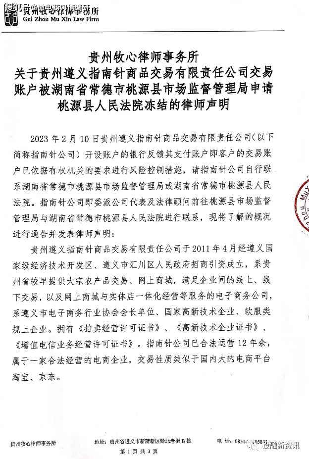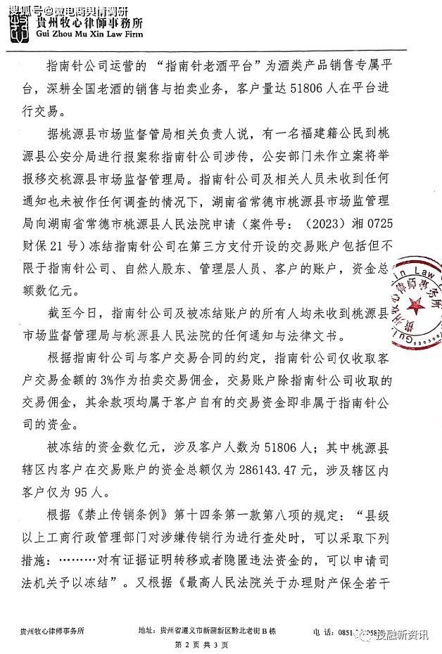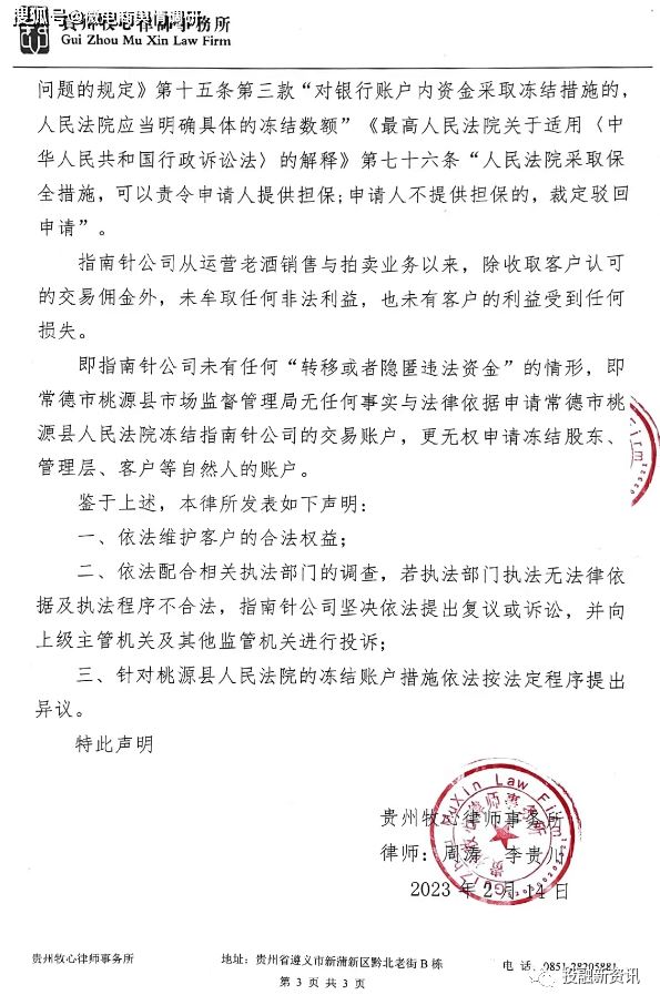 2月15日,投融新资讯在指南针老酒微信公众号留意到一份由贵州牧心律师事务所发布于凌晨的声明:
